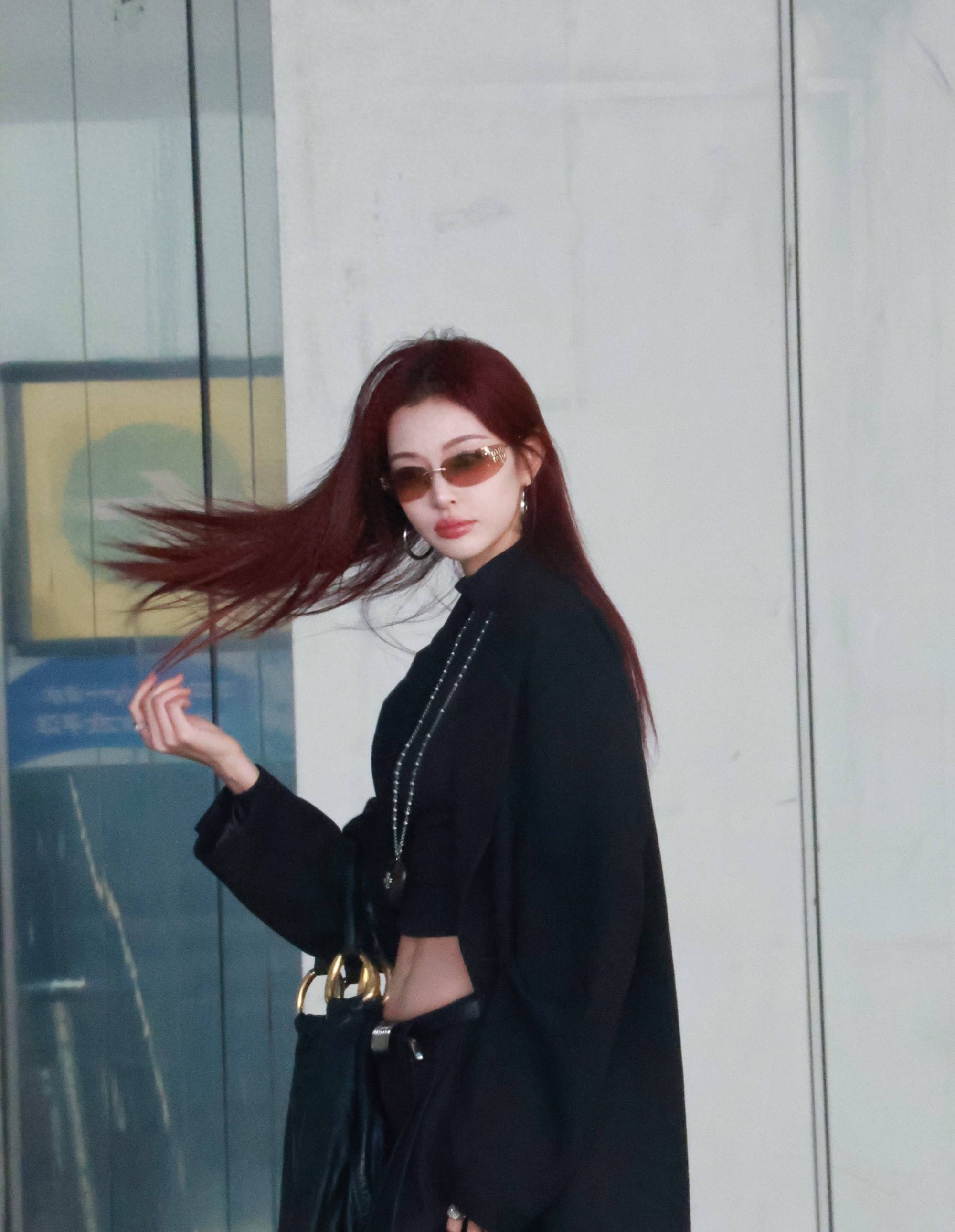 红发搭黑西装尽显利落张力,露腰针织衫添几分随性